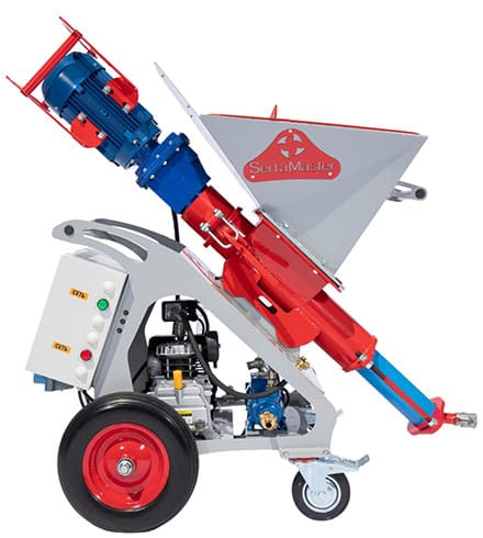 Раствор готовится в штукатурной станции непрерывного цикла, подается под давлением через шланг и распыляется на стену. Высокая скорость подачи обеспечивает плотное заполнение пустот, монолитность слоя и отсутствие воздушных пузырей.