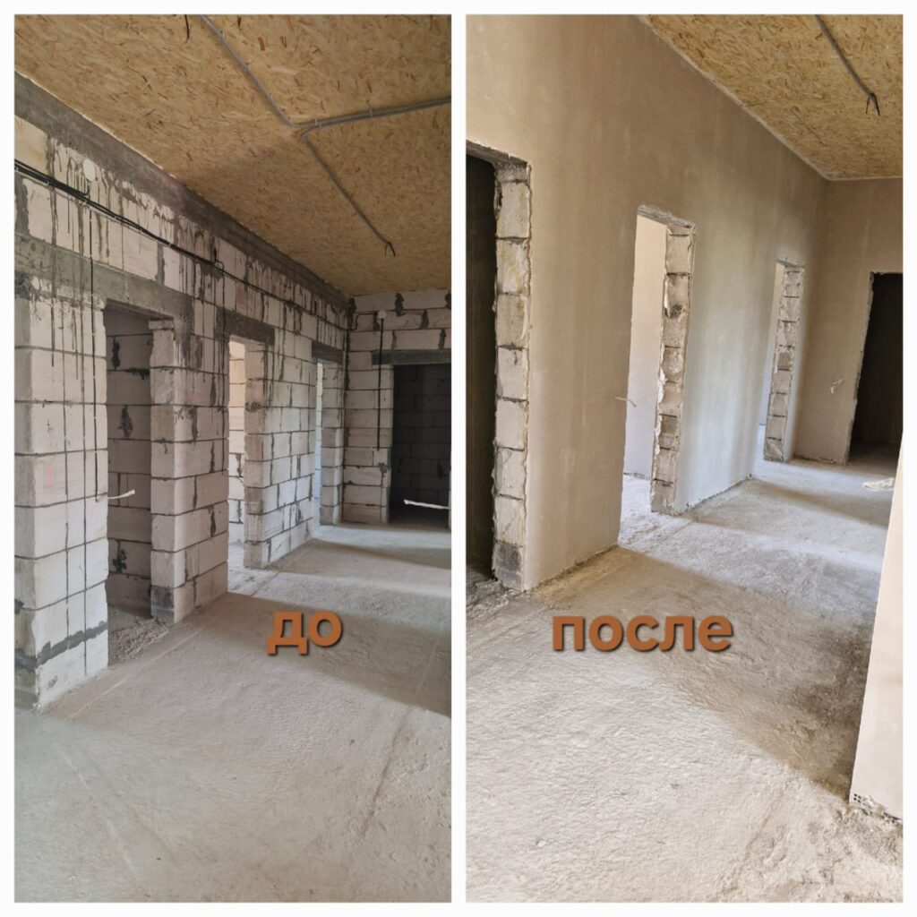 Все отходы упаковки, обрезки маяков, остатки смеси упаковываем и вывозим с объекта. Вы принимаете чистое помещение с готовыми стенами.